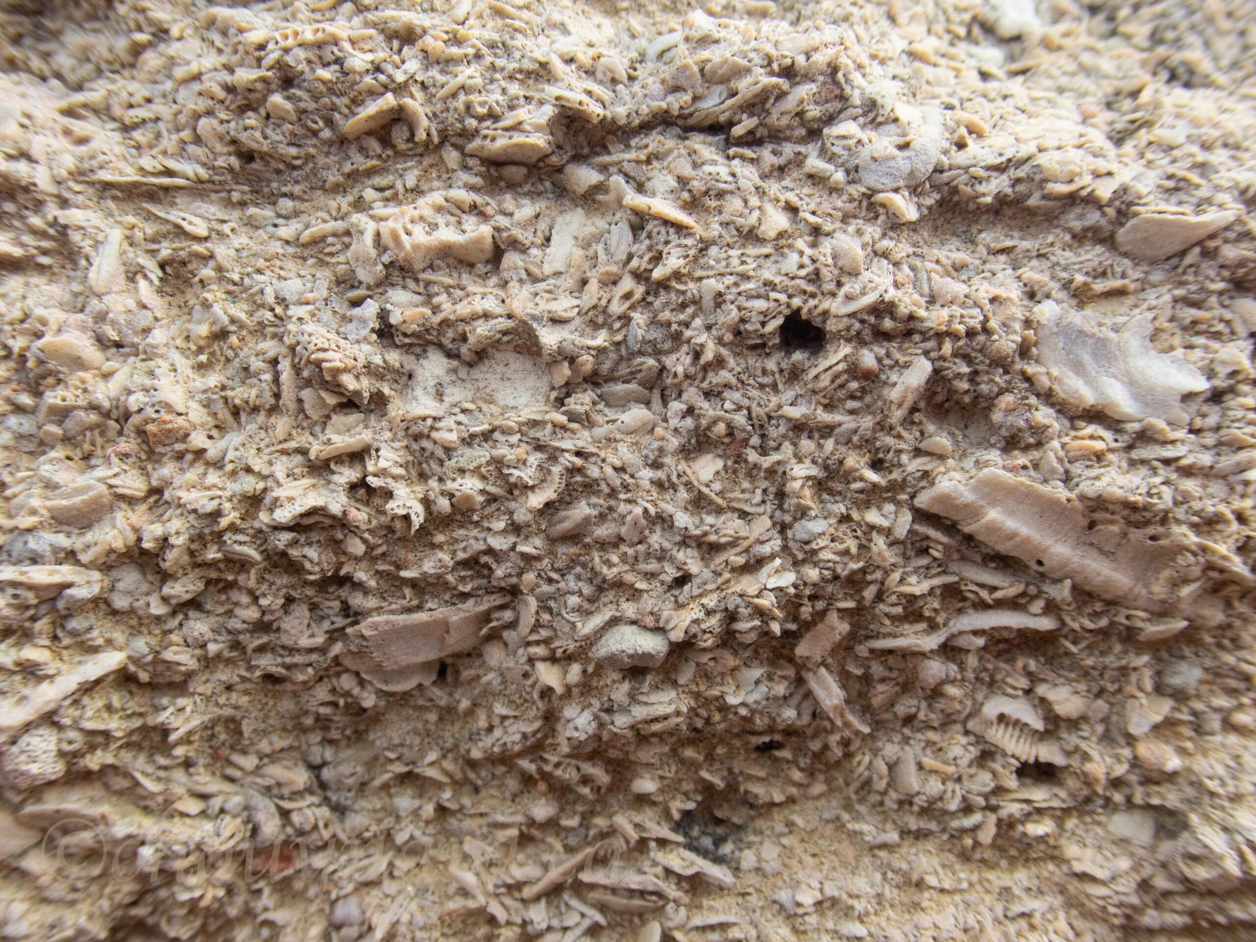L’aqueduc Saint-Clément, dit aussi «des Arceaux», conduisait l’eau sur 14 kilomètres en provenance de la commune de Saint-Clément-de-Rivière jusqu’au centre de Montpellier. Photo prise en 2025 En regardant de plus près une des grosse pierre de l’aqueduc étrillée par le temps, on se rend compte qu’il est, entre autre, composé d’innombrables et minuscules morceaux de coquillages. Photo prise en 2025